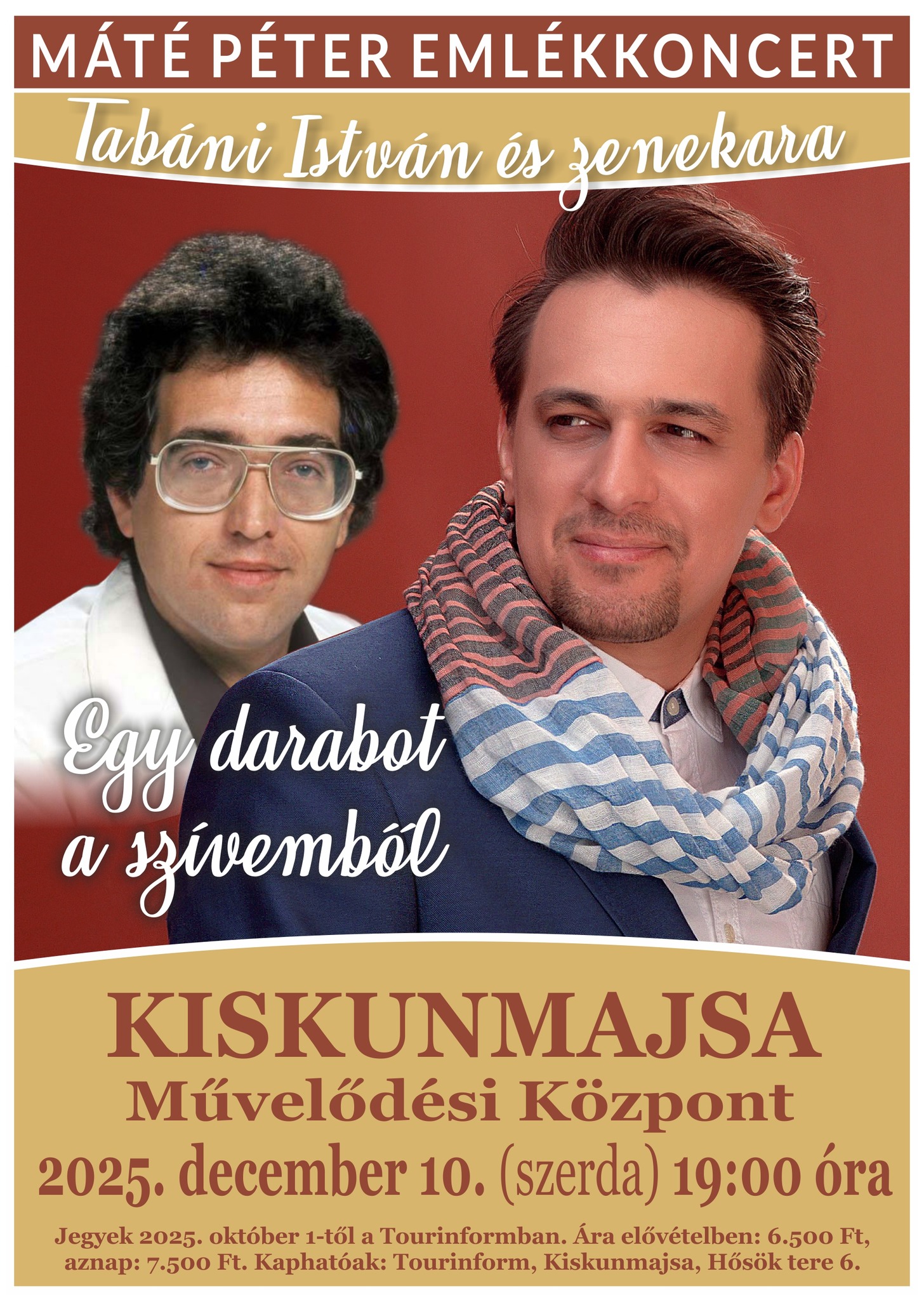 Egy felejthetetlen este, ahol a magyar könnyűzene egyik legnagyobb legendájának dalai csendülnek fel. Tabáni István és zenekara különleges emlékkoncerttel idézi meg Máté Péter örök érvényű slágereit.